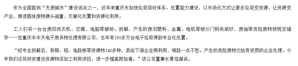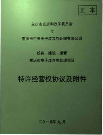 從2010年開始,公司就是重慶市政府公開招投標(biāo)確定的重慶市電子廢棄物處理特許經(jīng)營(yíng)權(quán)企業(yè),在重慶市“一小時(shí)經(jīng)濟(jì)圈”范圍內(nèi)23個(gè)區(qū)縣,開展電子廢棄物綜合回收機(jī)處理處置業(yè)務(wù)。